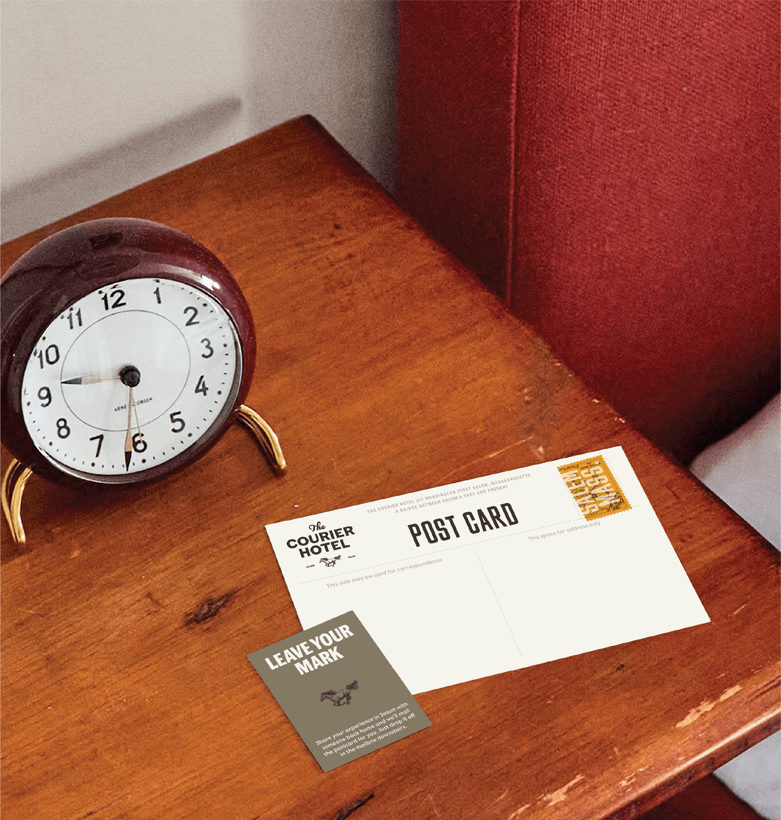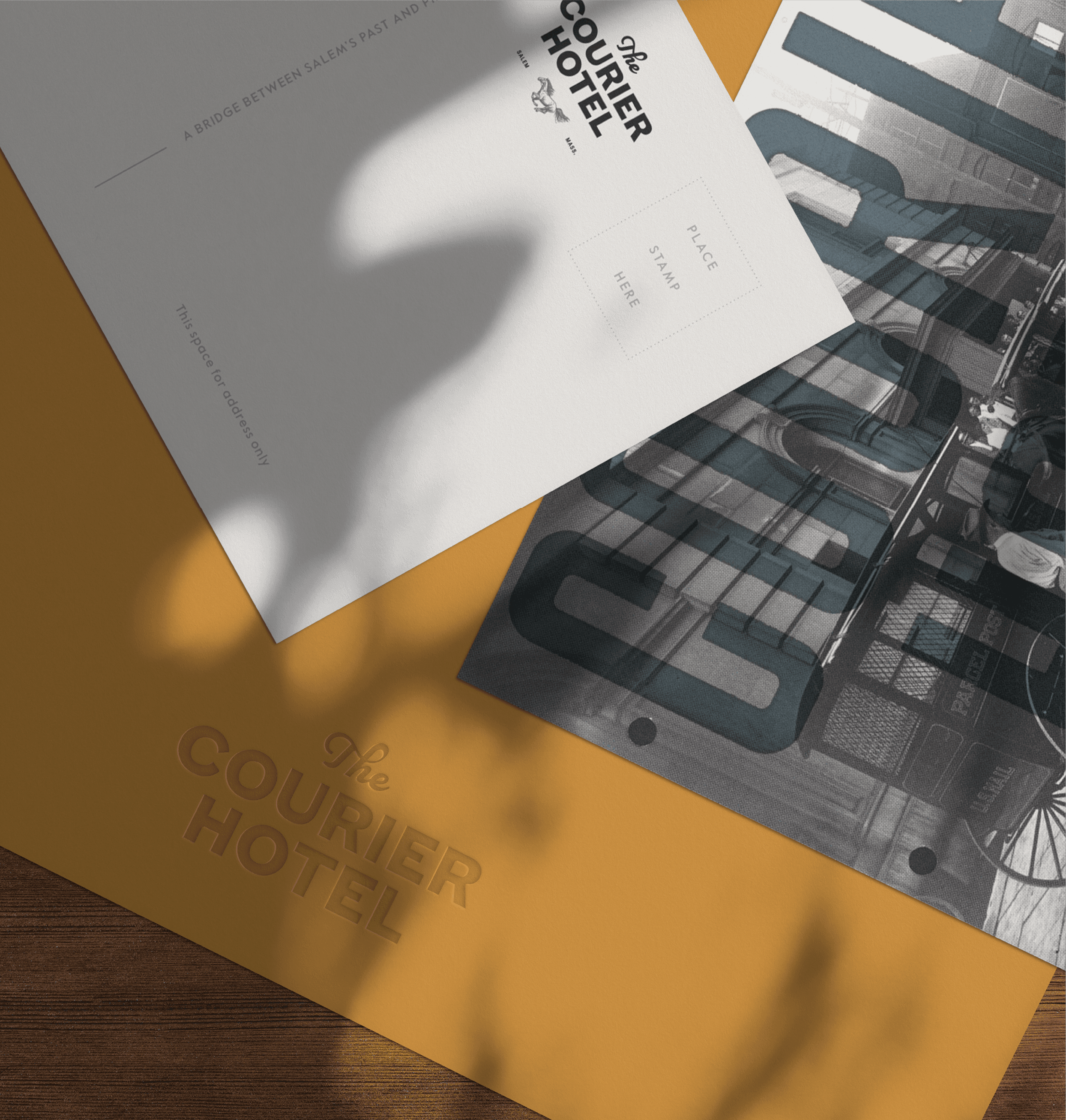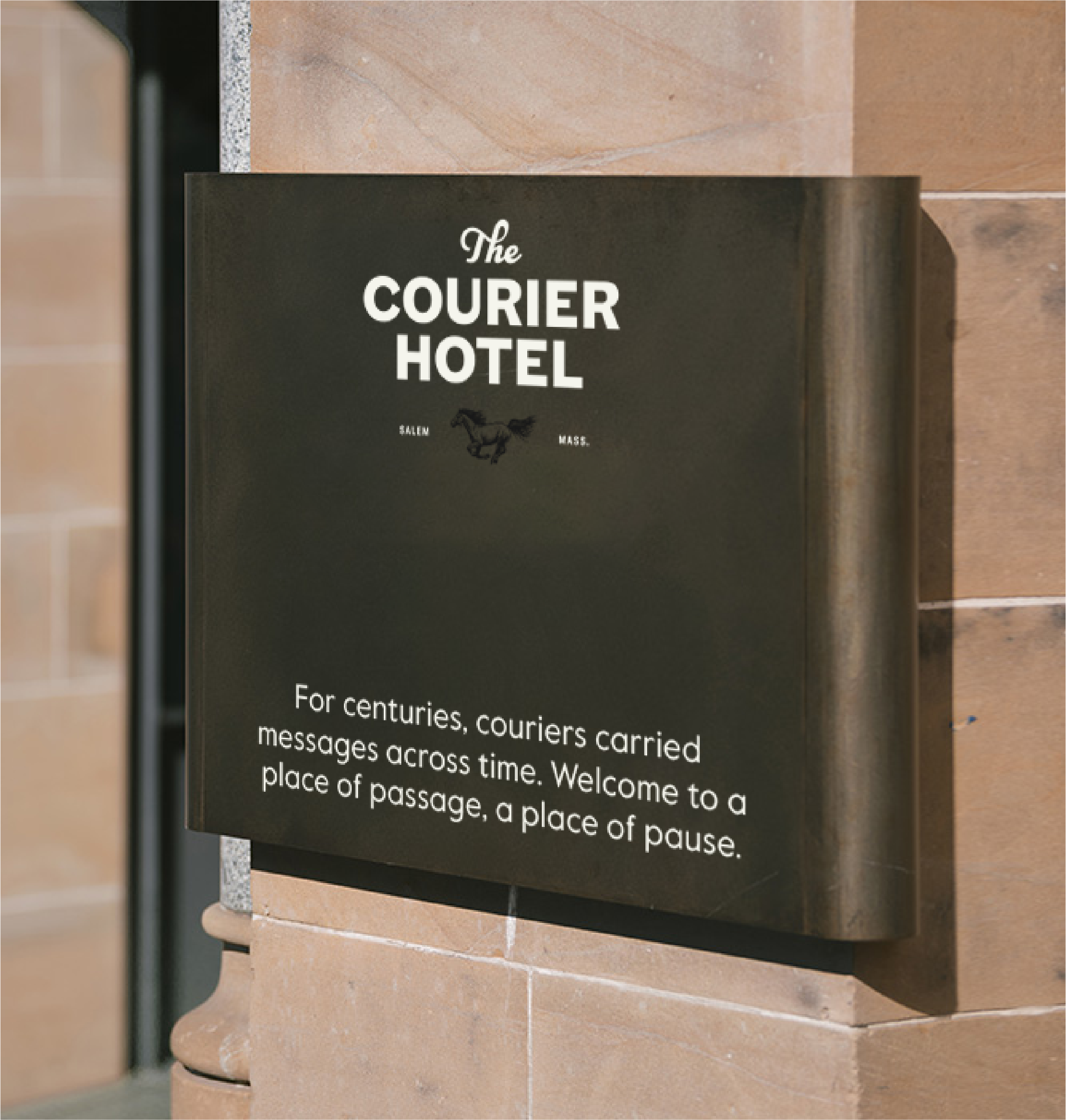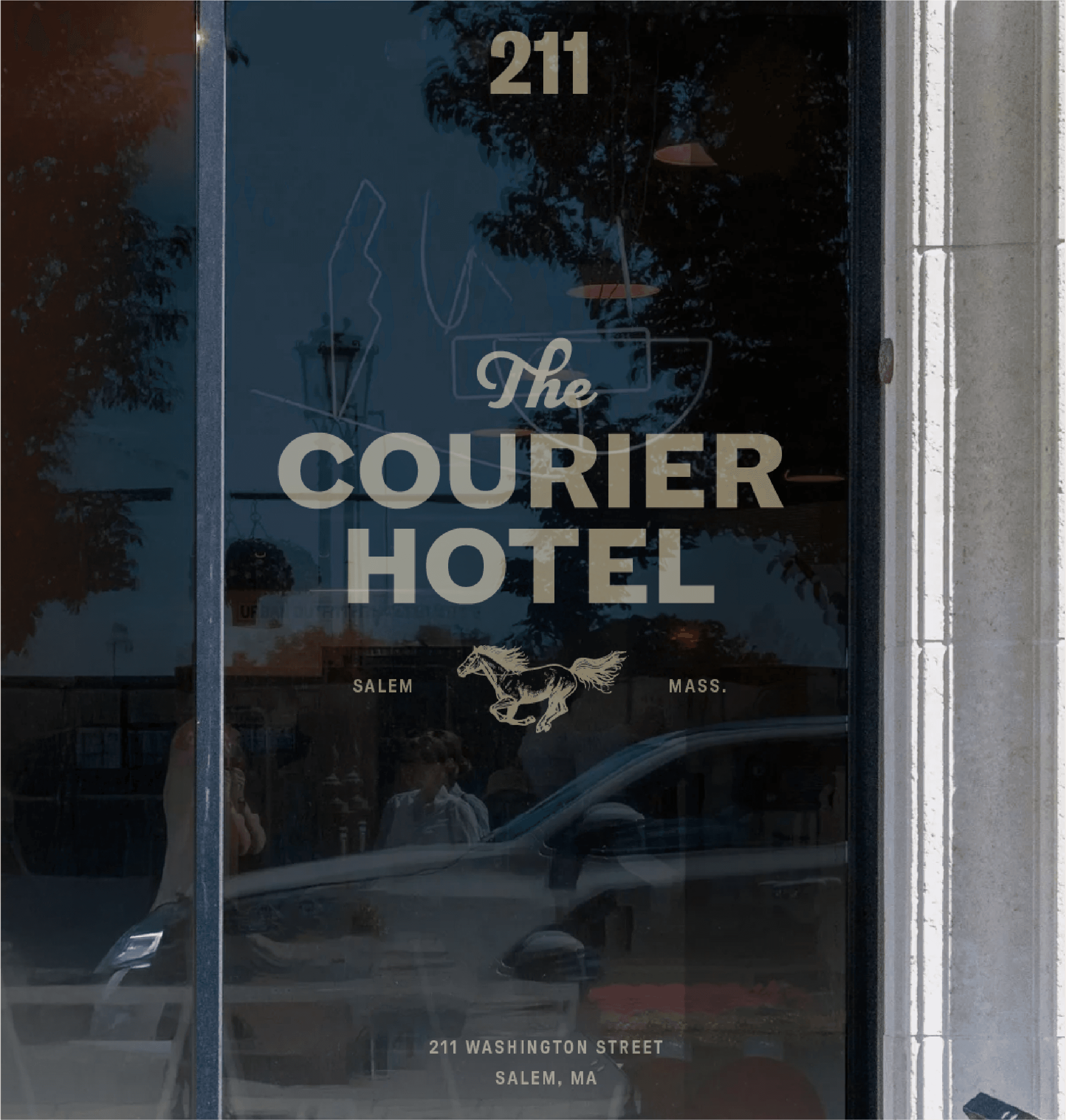 Salem’s hospitality landscape tends to circle the same references. Nautical cues, colonial styling, seasonal nostalgia. Courier takes a different position. The brand draws from movement and communication. The act of arriving, staying, and sending something forward. We avoided familiar coastal tropes entirely, allowing the hotel to feel rooted in the city without blending into its surroundings. Historic without becoming decorative. Contextual without imitation.