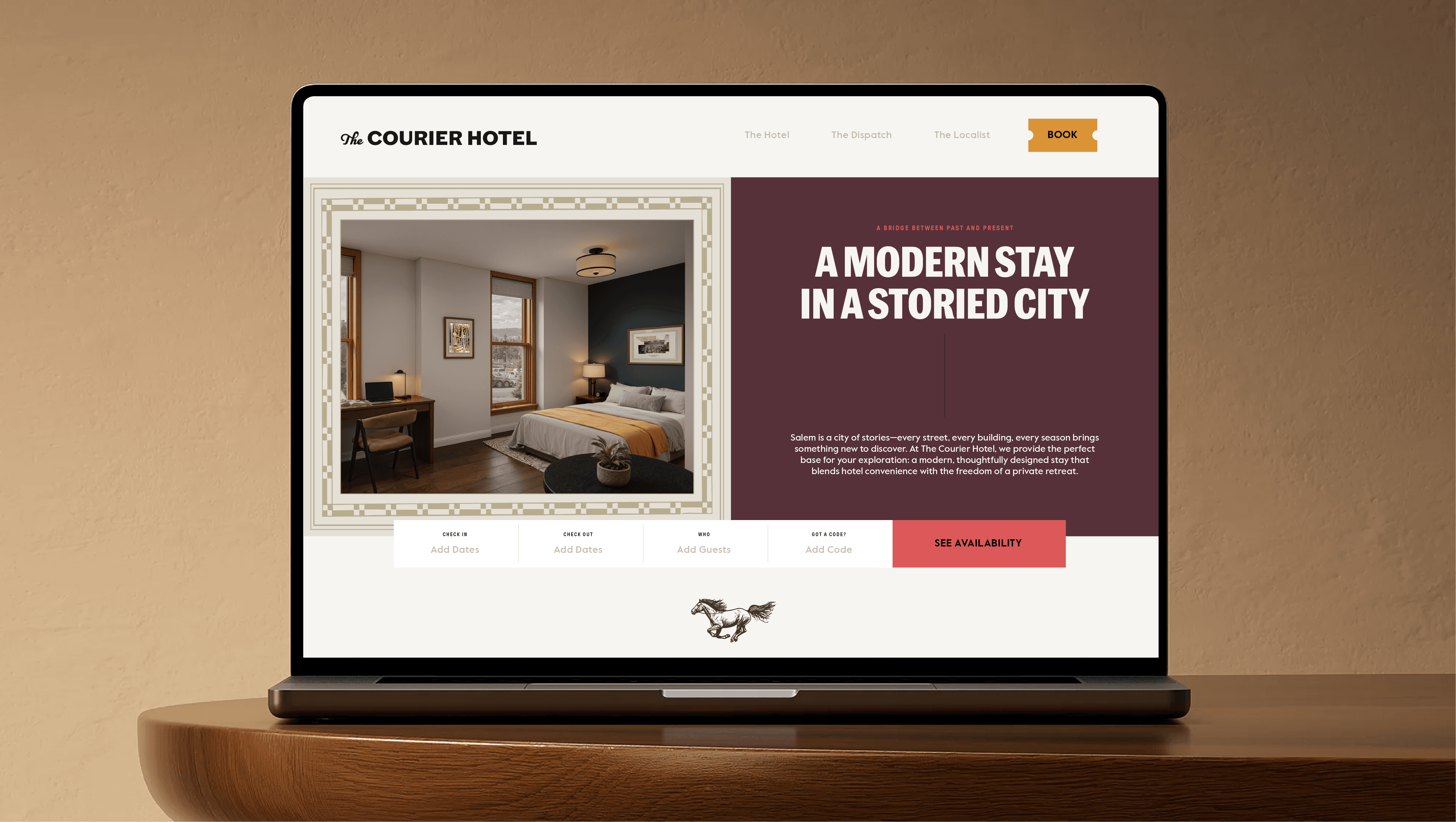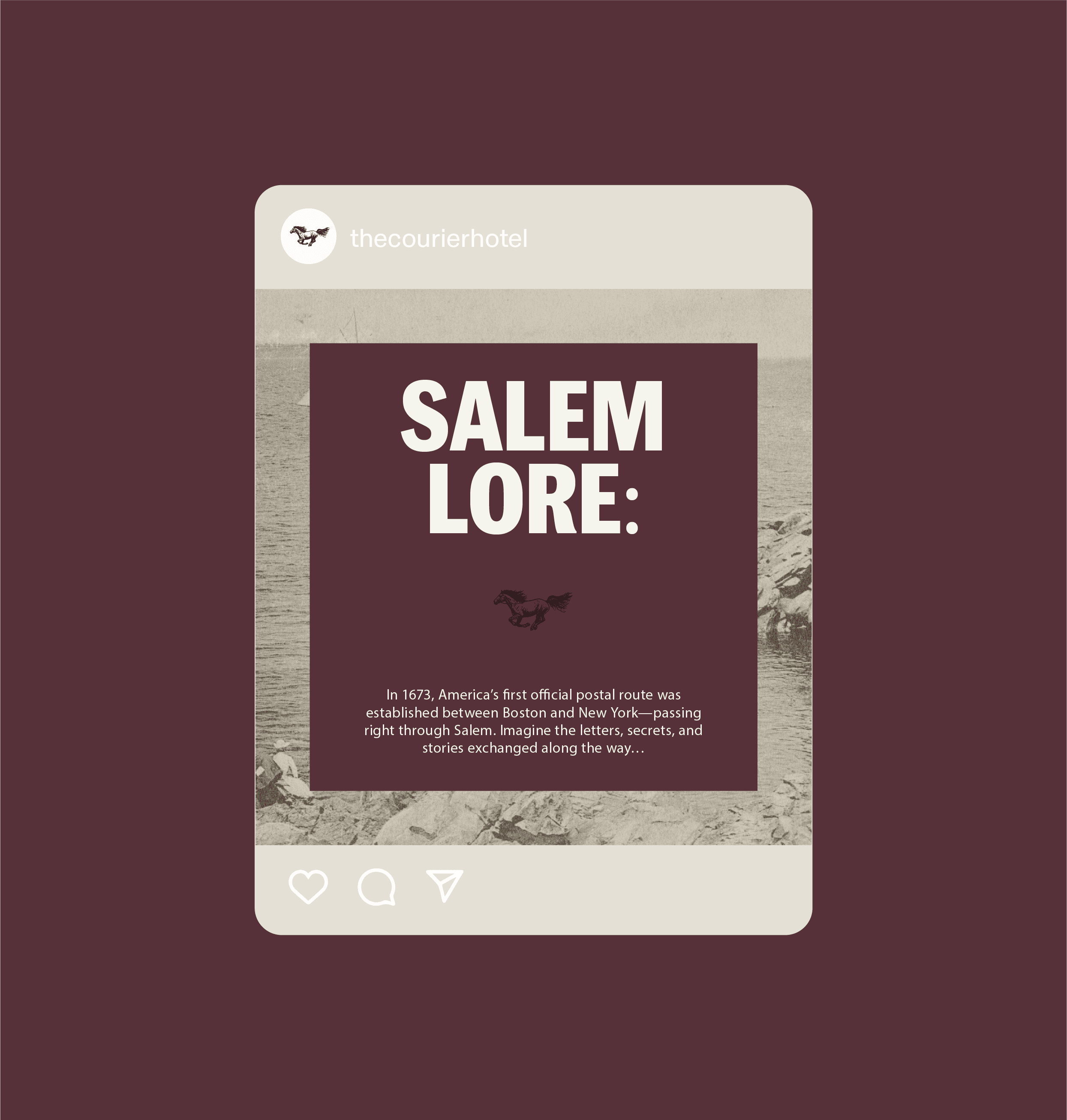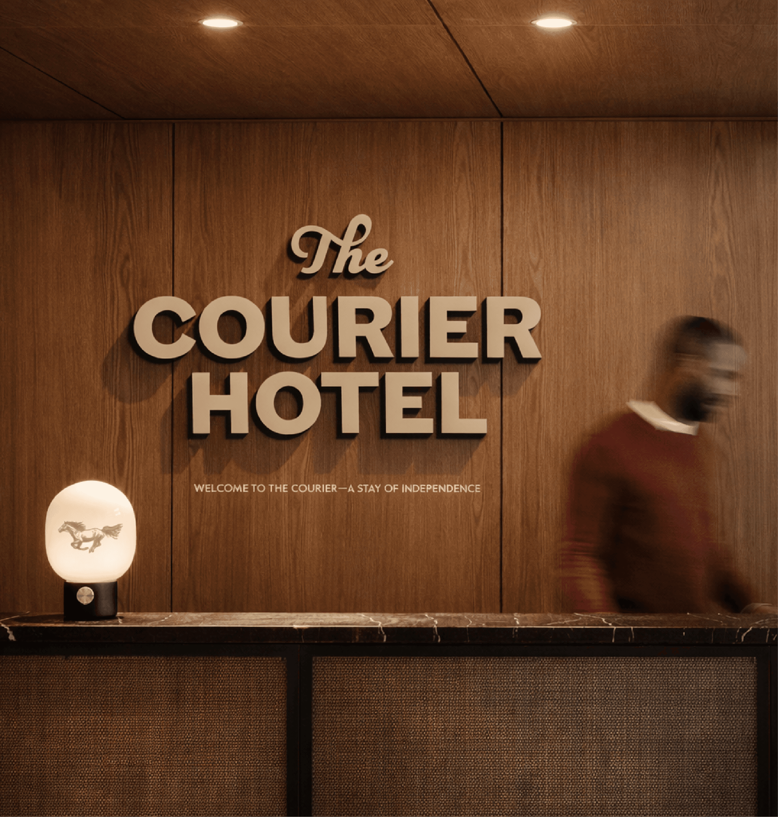 Salem’s hospitality landscape tends to circle the same references. Nautical cues, colonial styling, seasonal nostalgia. Courier takes a different position. The brand draws from movement and communication. The act of arriving, staying, and sending something forward. We avoided familiar coastal tropes entirely, allowing the hotel to feel rooted in the city without blending into its surroundings. Historic without becoming decorative. Contextual without imitation.