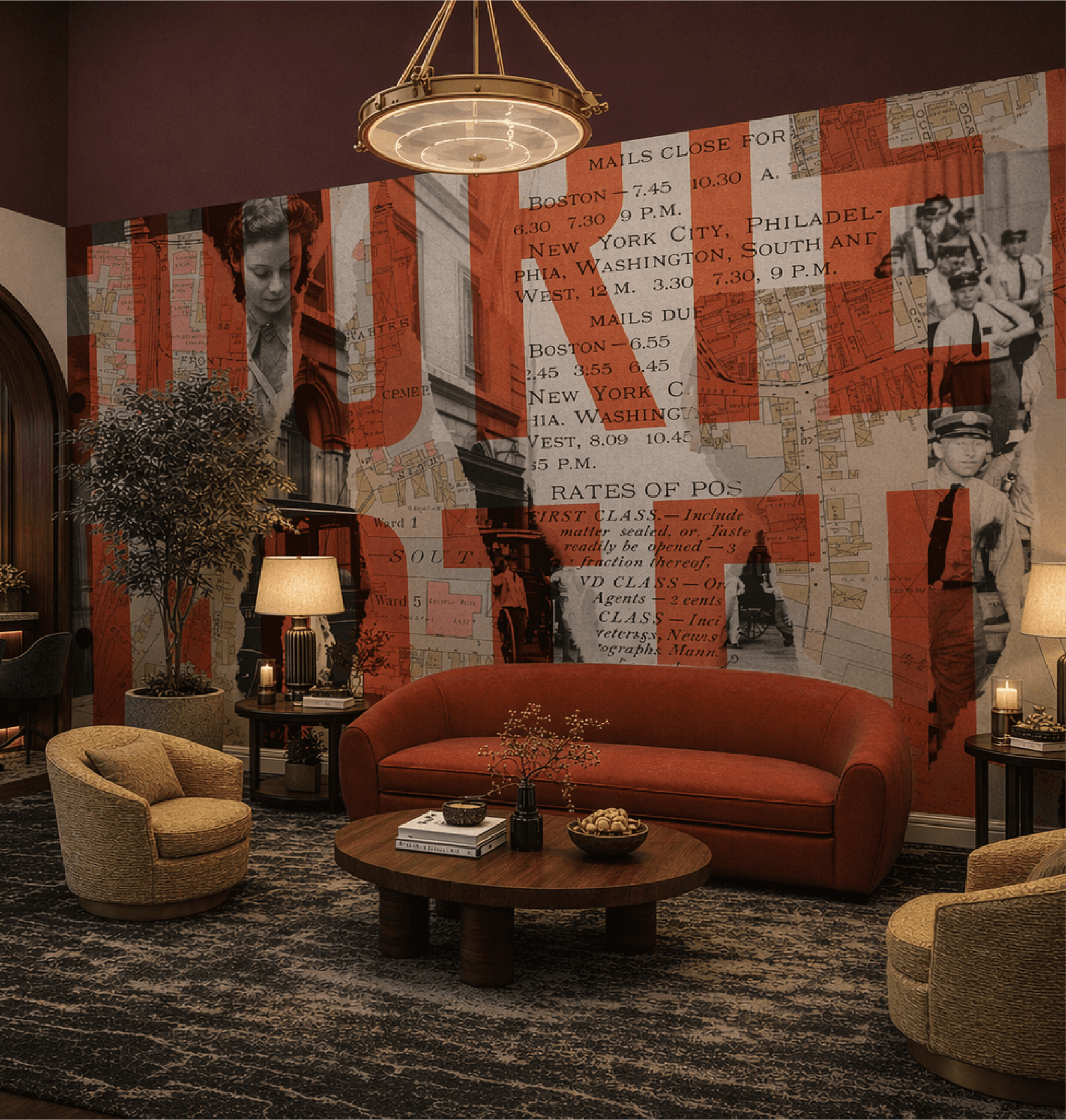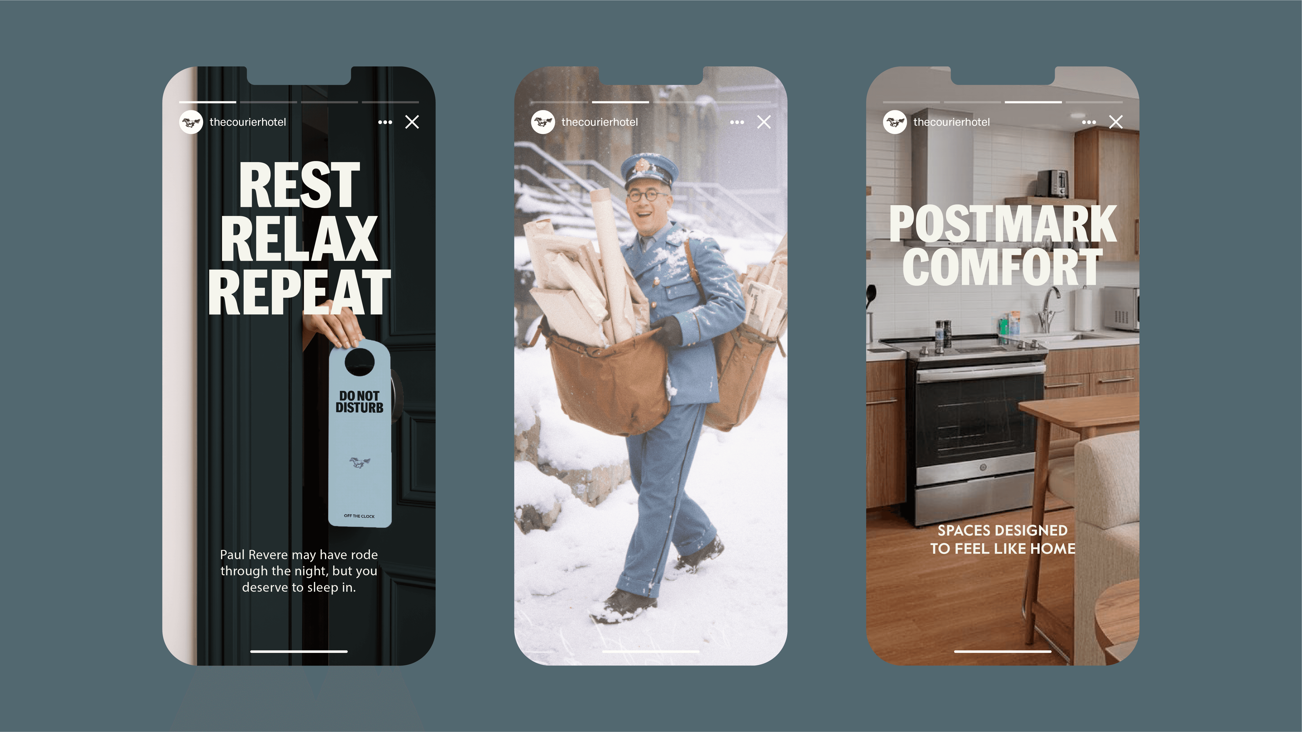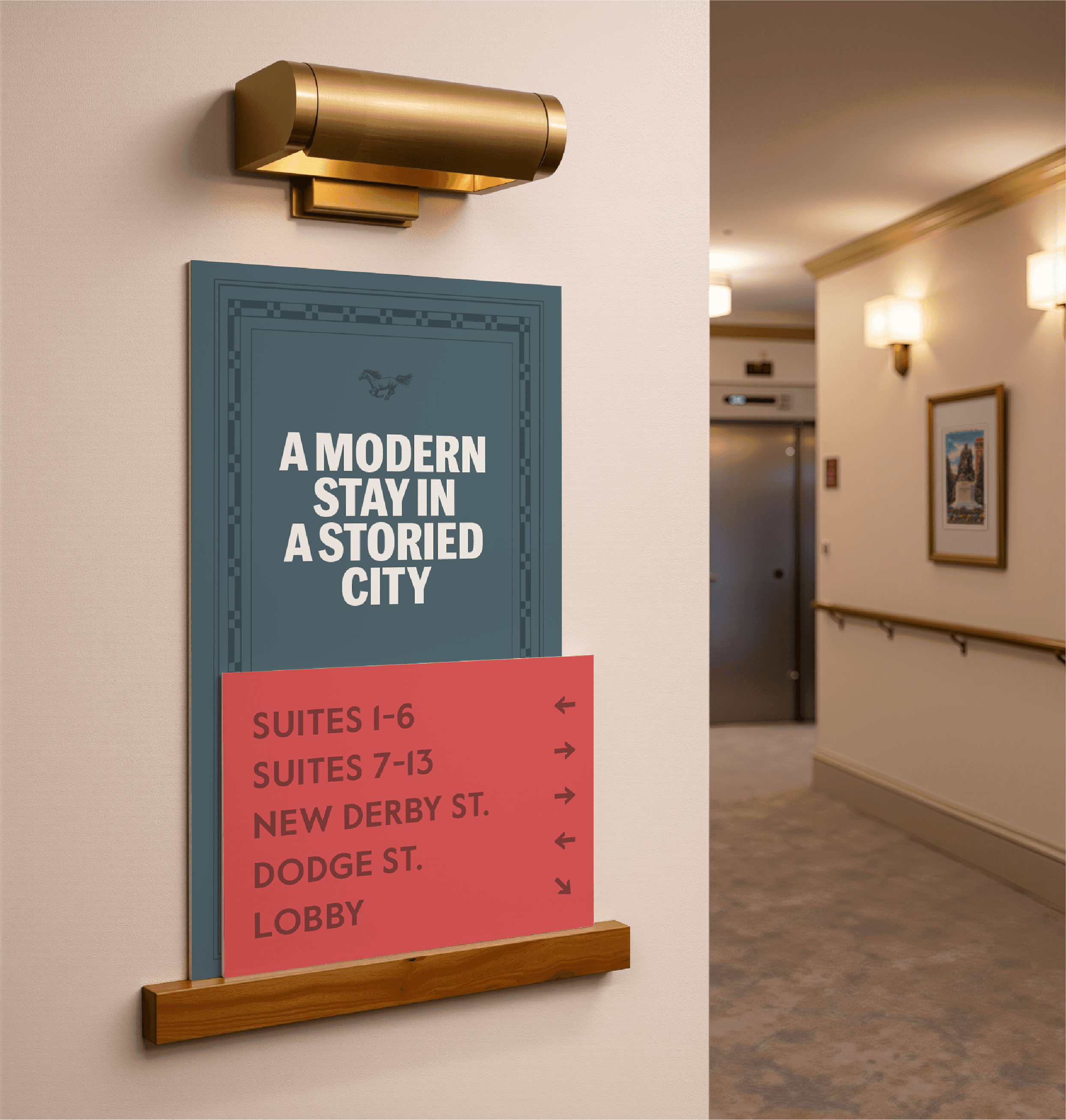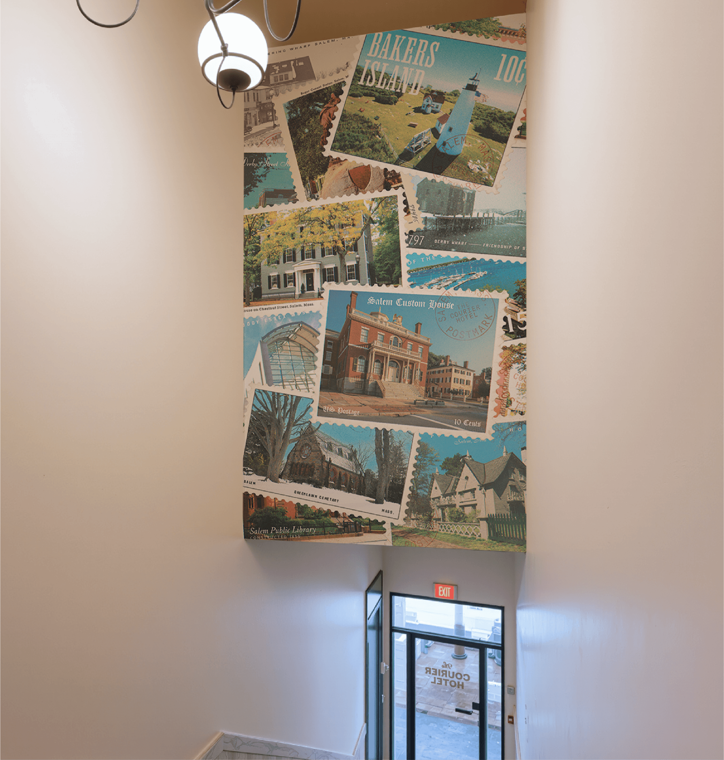 Salem’s hospitality landscape tends to circle the same references. Nautical cues, colonial styling, seasonal nostalgia. Courier takes a different position. The brand draws from movement and communication. The act of arriving, staying, and sending something forward. We avoided familiar coastal tropes entirely, allowing the hotel to feel rooted in the city without blending into its surroundings. Historic without becoming decorative. Contextual without imitation.