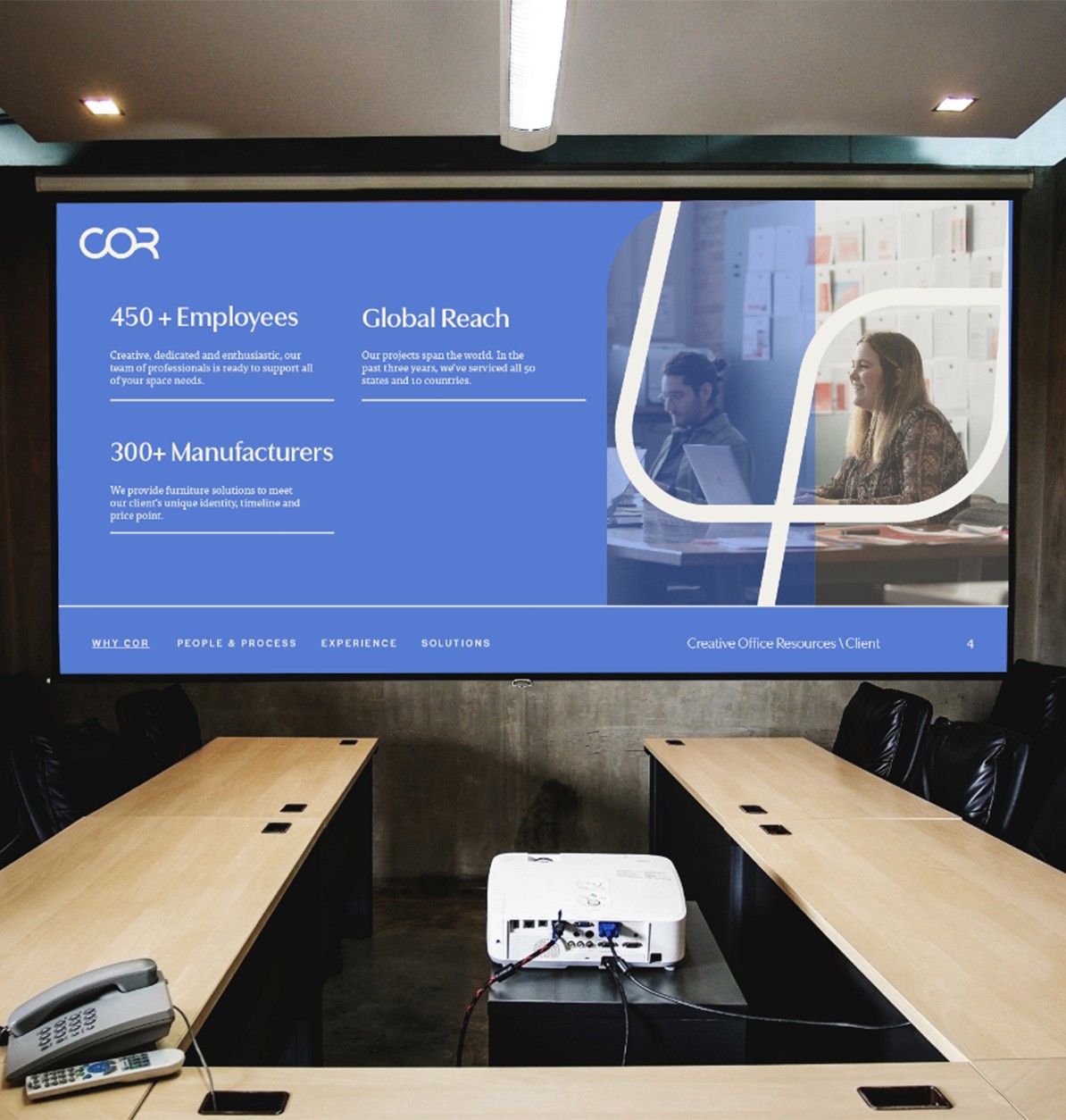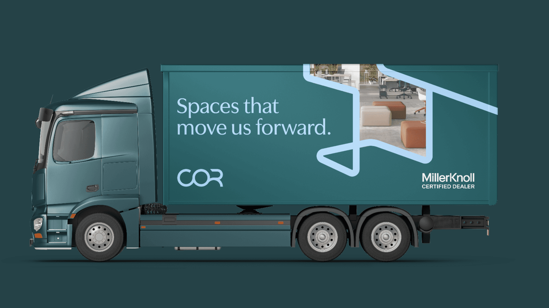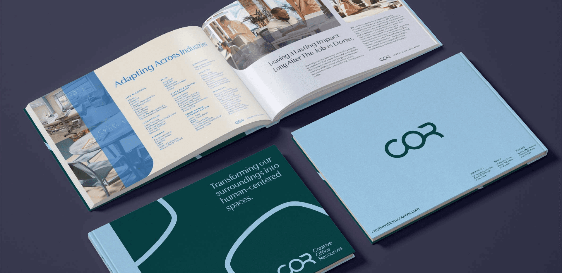 Line work was inspired by forms within the furniture, paying tribute to their design process in a compelling way. These elements are also used to create a focal point when cropping imagery, making an otherwise static image feel dynamic and interesting. That variety of color and forms speaks to COR’s wide range of services and breadth of knowledge in the industry.
