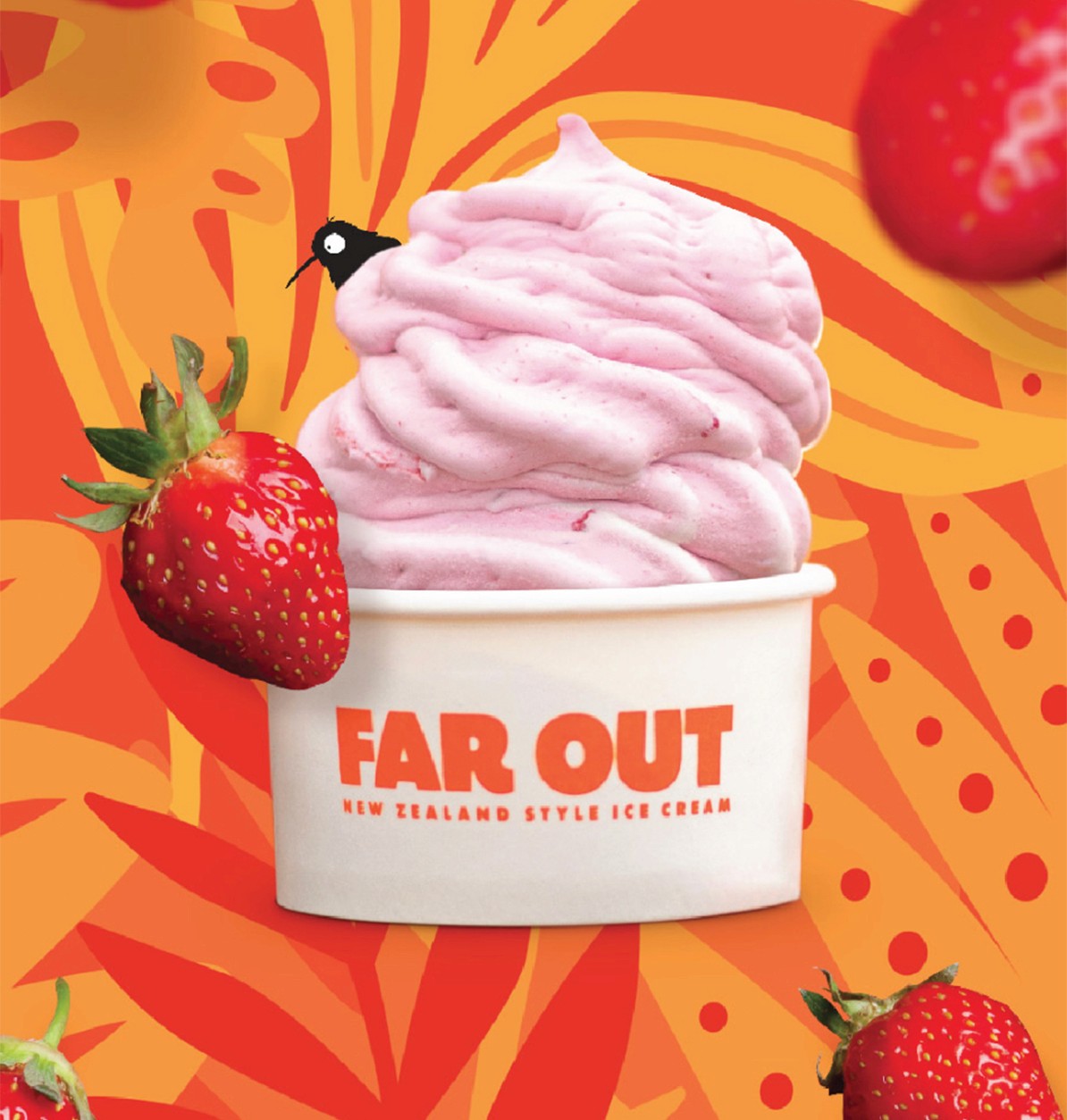 We knew the name should be inspired by the ice cream’s New Zealand origins. After an extensive exercise we landed on “Far Out”, alluding to how far away the ice cream’s homeland is from here, while playing on a fun expression. During that exercise, we had a few favorites that we didn’t want to lose, including Enzy who ended up being the Far Out mascot, and Kookaberry, their signature flavor.