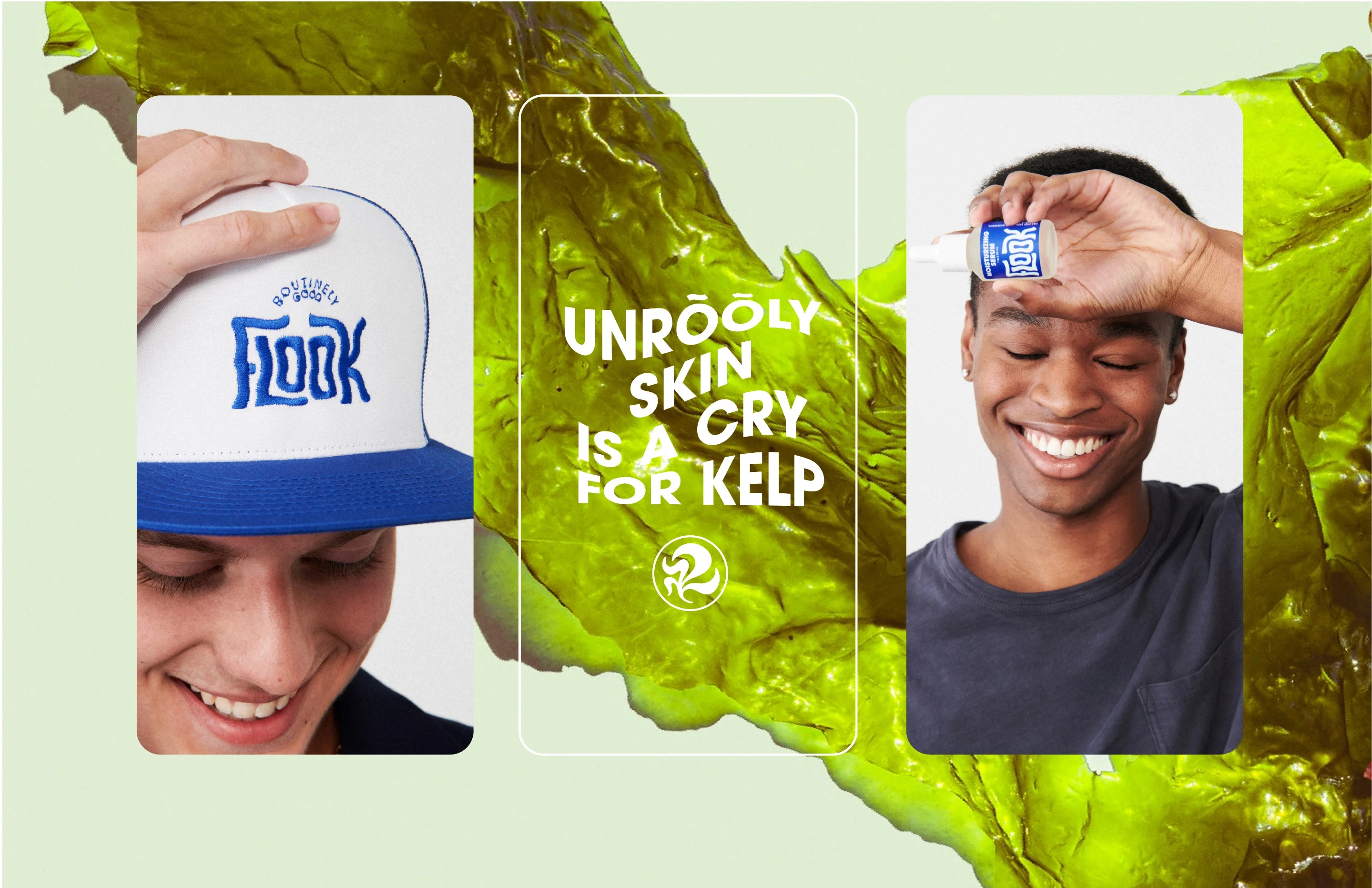 Flook harnesses the power of sea kelp to nourish skin. We knew that this was where to lean in to emphasize Flook’s natural ingredients and maintain a young aesthetic that avoids the dark, masculine branding typically pushed on young men. With the sea as our guide, we set forth to bring together a cohesive visual identity across all aspects of the Flōōk brand.