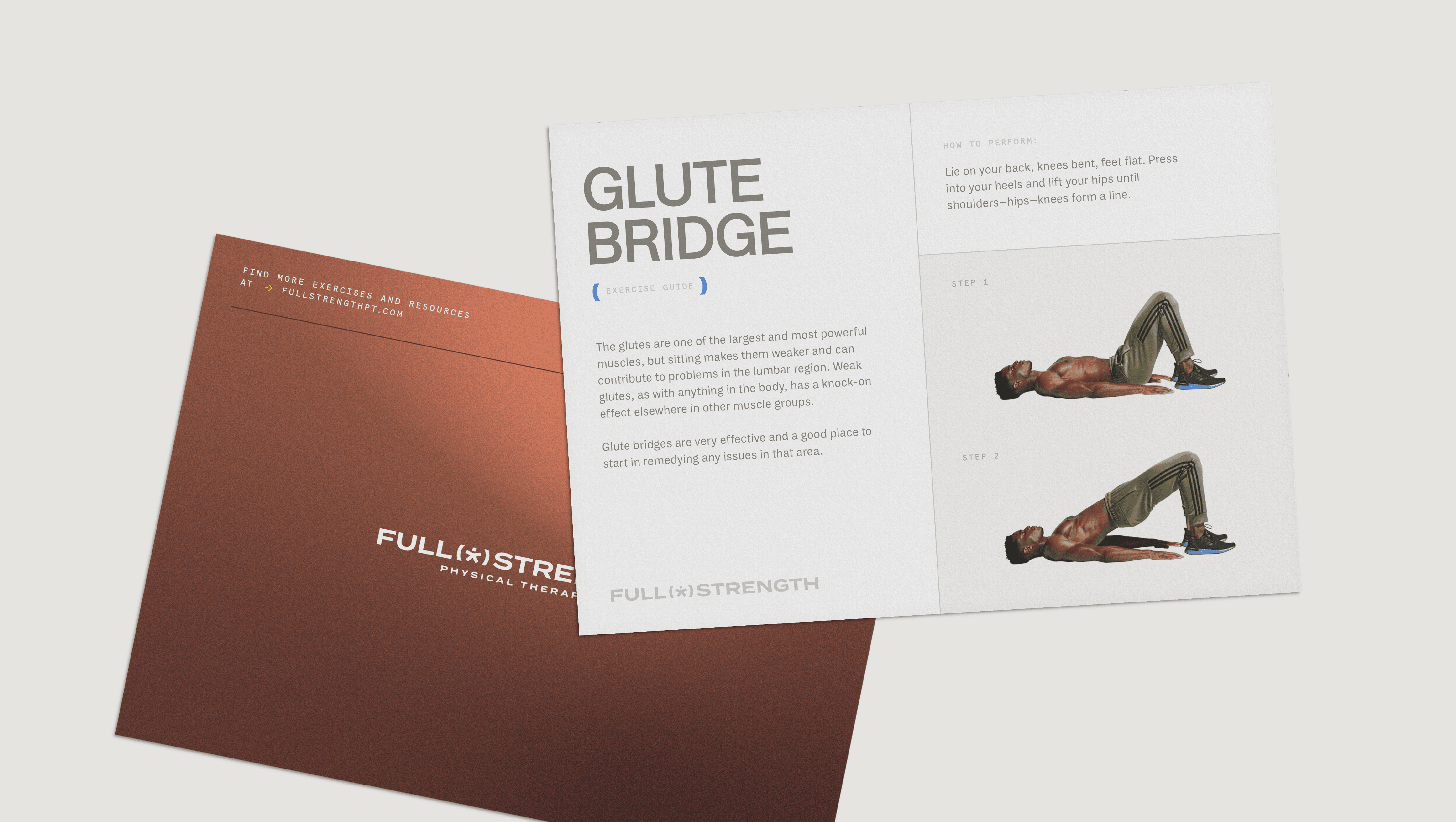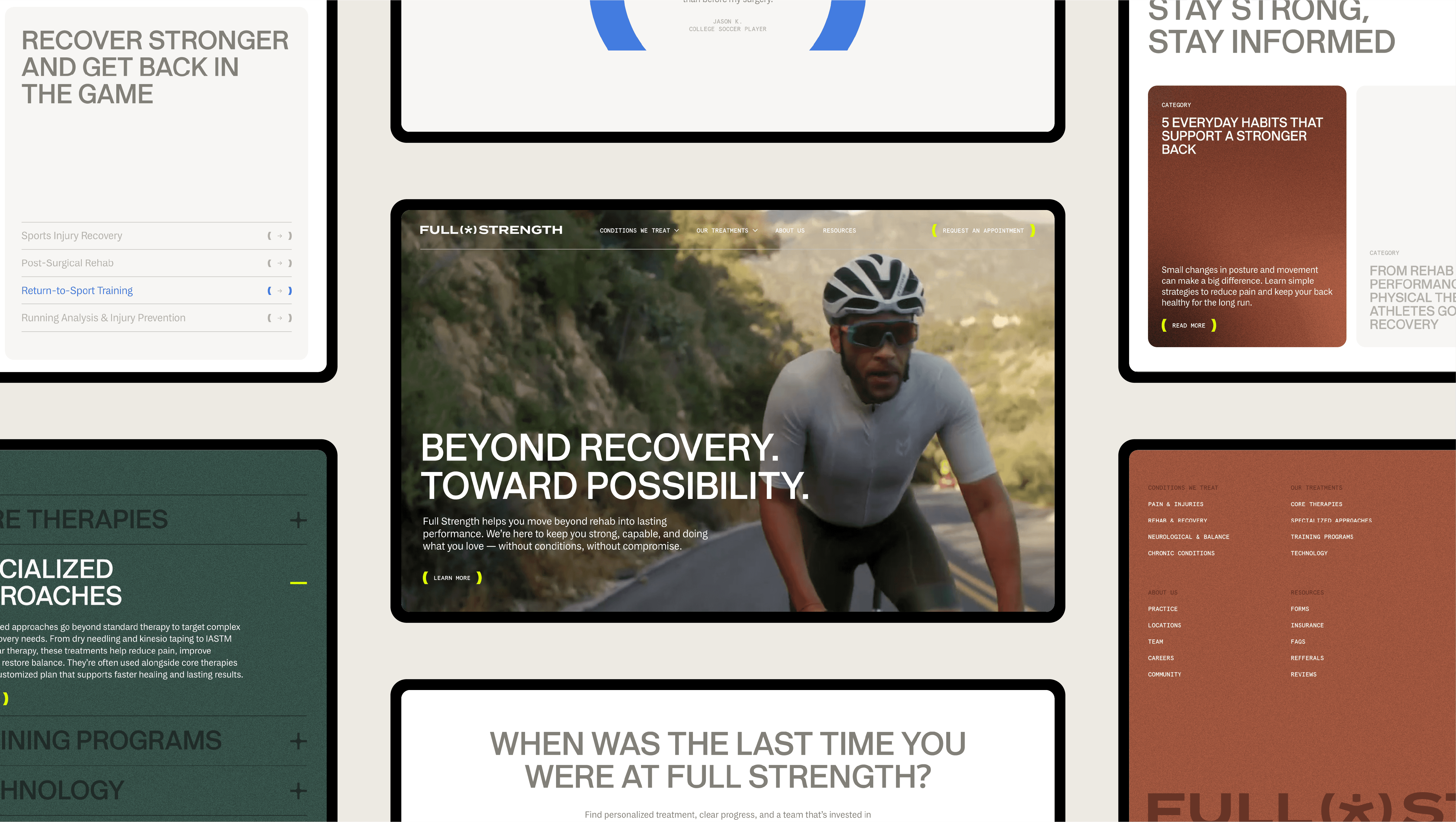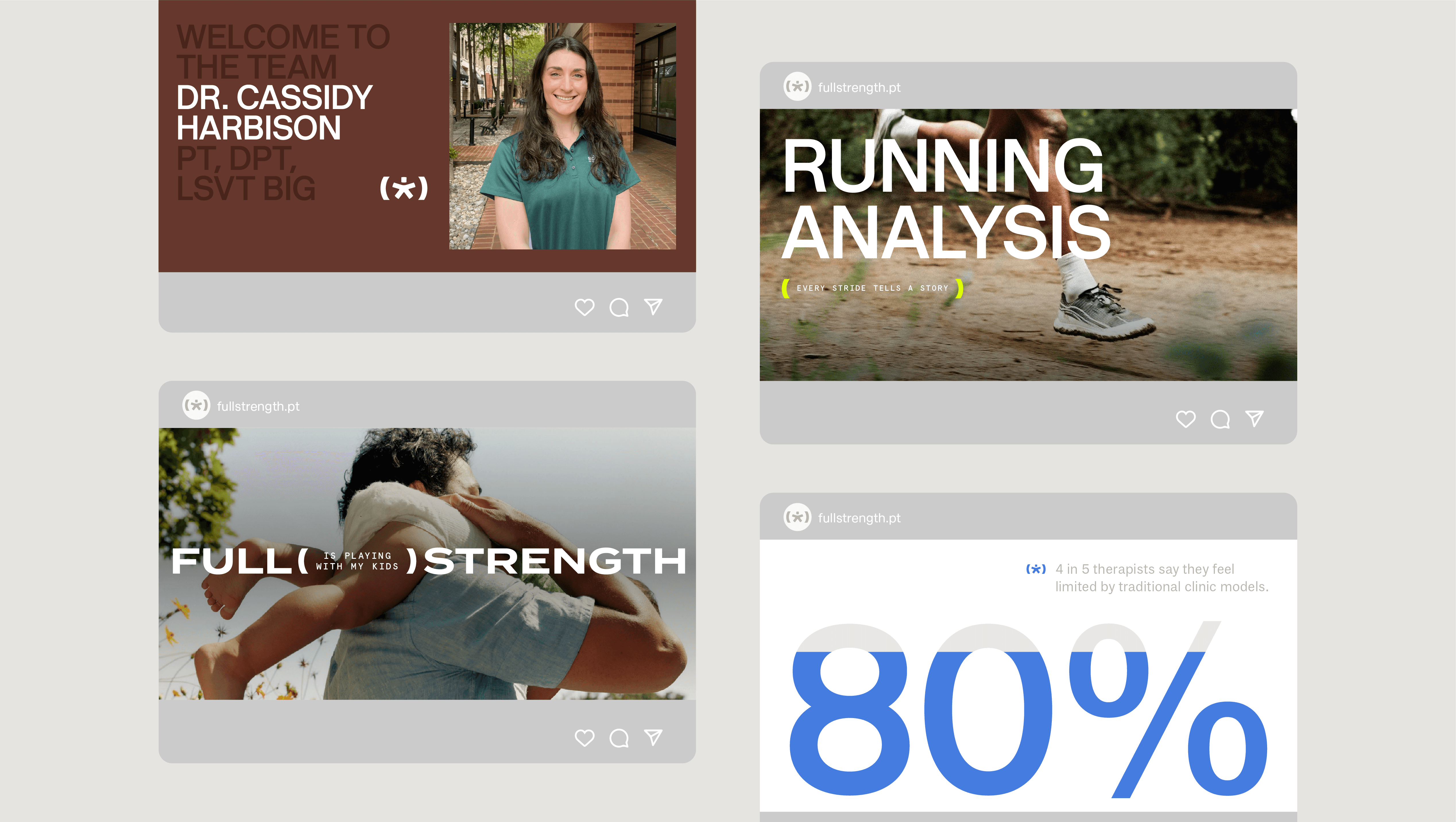 Full Strength launched with a clear position in the market: a practice that treats injury and builds strength at the same time. The brand provides a foundation for growth across locations, services, and patient experience; supporting both immediate care and long-term progression.